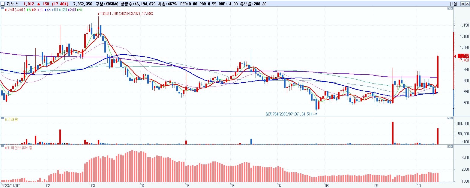 - 리노스 (1,012원 ▲ 17.4% , 시총: 467억, 거래량: 7,885,651, 거래대금:76억)