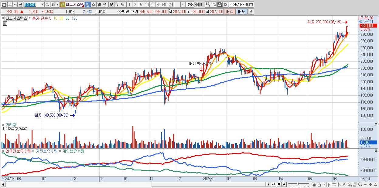 - 파크시스템스 (281,500원 ▲ 4.45% , 시총: 19,677억, 거래량: 36,583, 거래대금:102억, KOSDAQ)