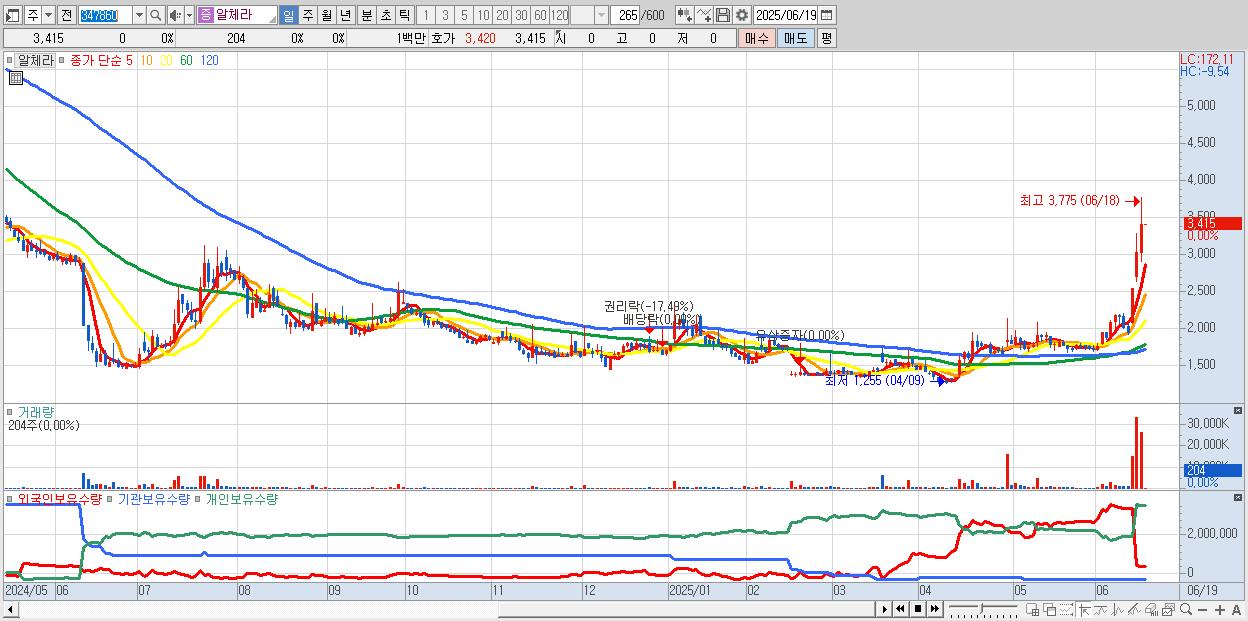 - 알체라 (3,415원 ▲ 12.89% , 시총: 1,322억, 거래량: 26,128,749, 거래대금:881억, KOSDAQ)