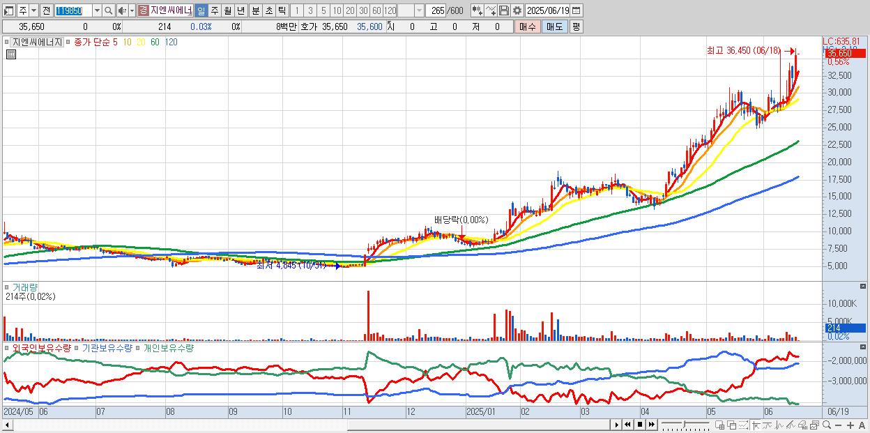 - 지엔씨에너지 (35,650원 ▲ 8.85% , 시총: 5,864억, 거래량: 700,402, 거래대금:244억, KOSDAQ)