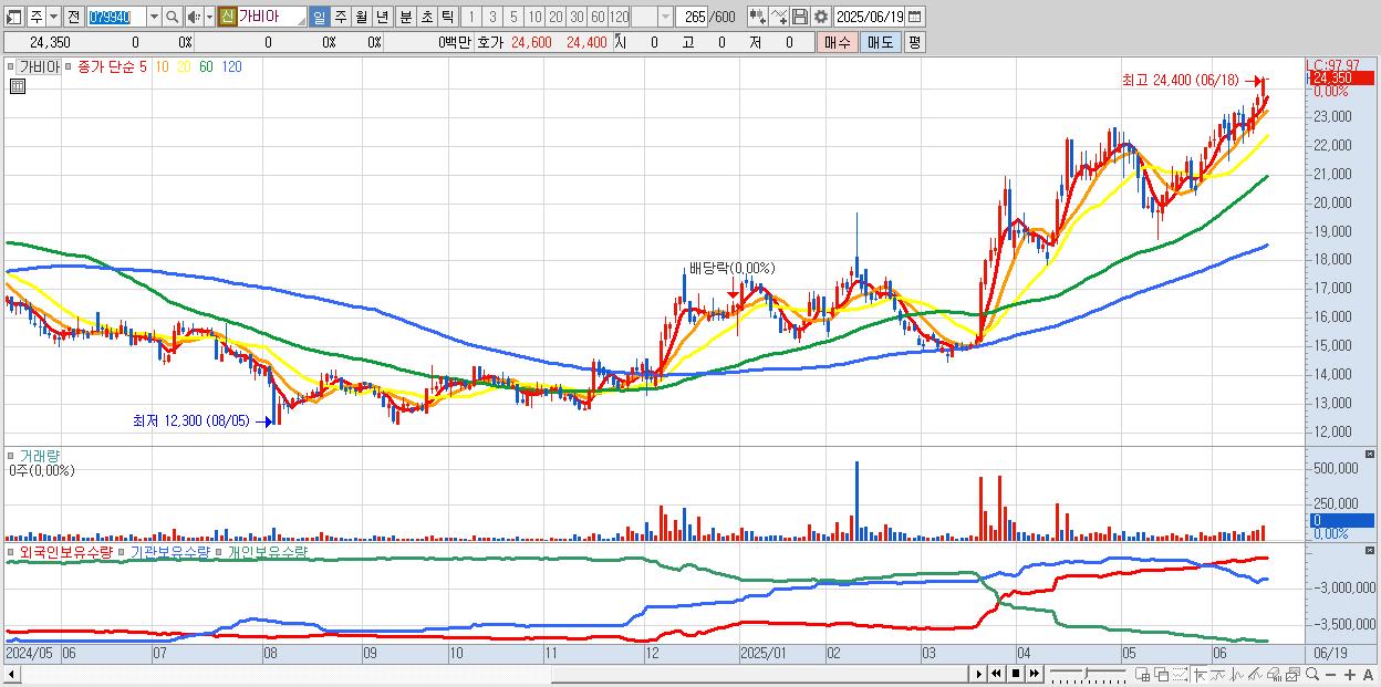 - 가비아 (24,350원 ▲ 2.74% , 시총: 3,296억, 거래량: 98,246, 거래대금:23억, KOSDAQ)