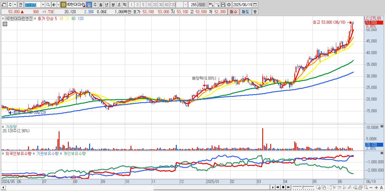 - HD현대마린엔진 (52,100원 ▲ 4.3% , 시총: 17,673억, 거래량: 557,567, 거래대금:292억, KOSPI)