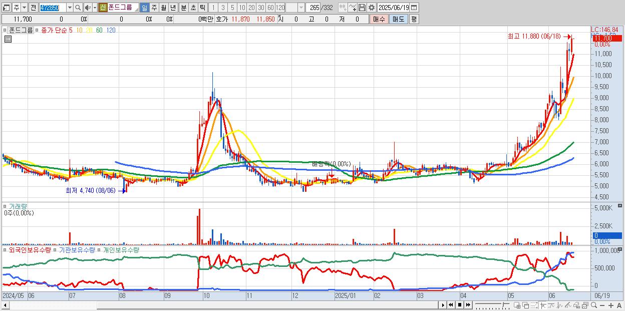 - 폰드그룹 (11,700원 ▲ 4.74% , 시총: 3,784억, 거래량: 306,962, 거래대금:35억, KOSDAQ)