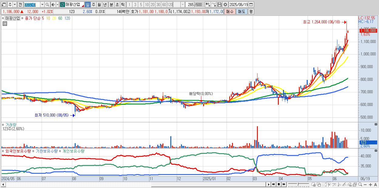 - 태광산업 (1,174,000원 ▲ 3.99% , 시총: 13,071억, 거래량: 3,942, 거래대금:46억, KOSPI)
