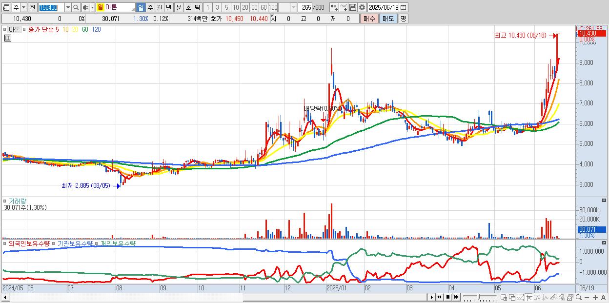 - 아톤 (10,430원 ▲ 24.91% , 시총: 2,587억, 거래량: 2,306,216, 거래대금:219억, KOSDAQ)