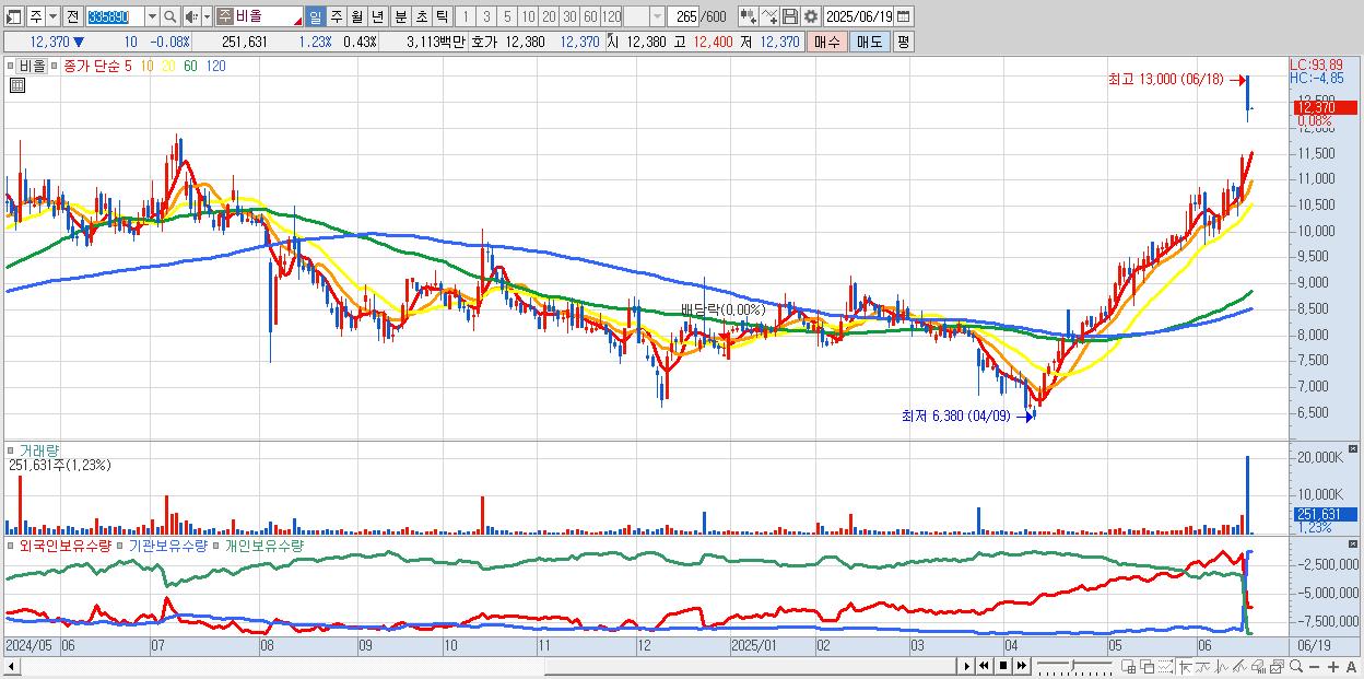 - 비올 (12,380원 ▲ 10.54% , 시총: 7,232억, 거래량: 10,276,628, 거래대금:1,271억, KOSDAQ)