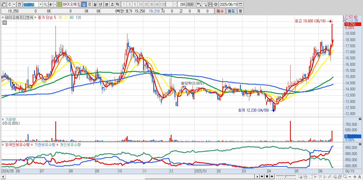 - 바이오에프디엔씨 (19,250원 ▲ 9.38% , 시총: 1,674억, 거래량: 481,496, 거래대금:92억, KOSDAQ)