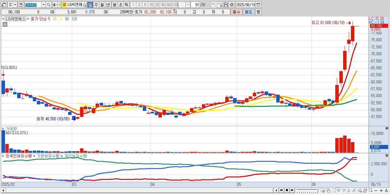 - LG씨엔에스 (80,100원 ▲ 6.52% , 시총: 77,606억, 거래량: 5,537,070, 거래대금:4,338억, KOSPI)