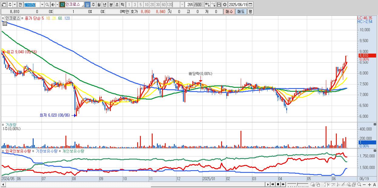 - 인크로스 (8,810원 ▲ 3.89% , 시총: 1,131억, 거래량: 234,078, 거래대금:20억, KOSDAQ)