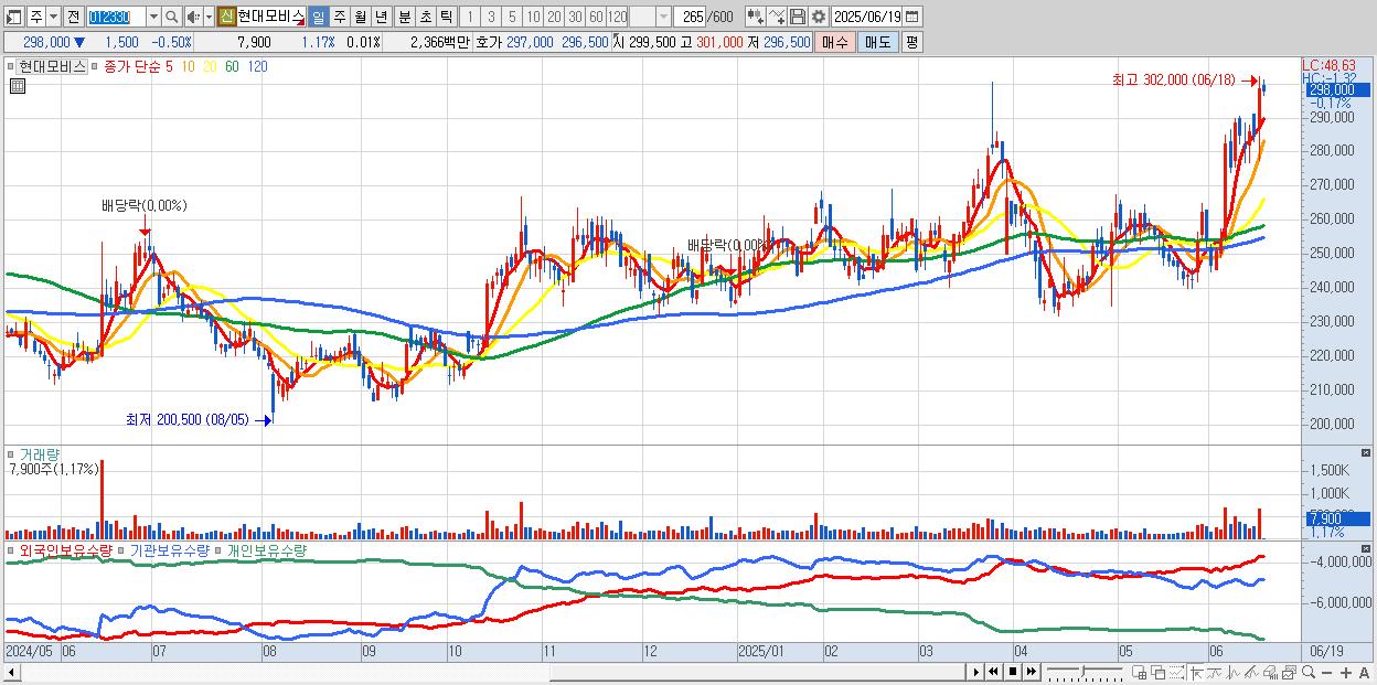 - 현대모비스 (299,500원 ▲ 4.72% , 시총: 274,926억, 거래량: 542,226, 거래대금:1,607억, KOSPI)