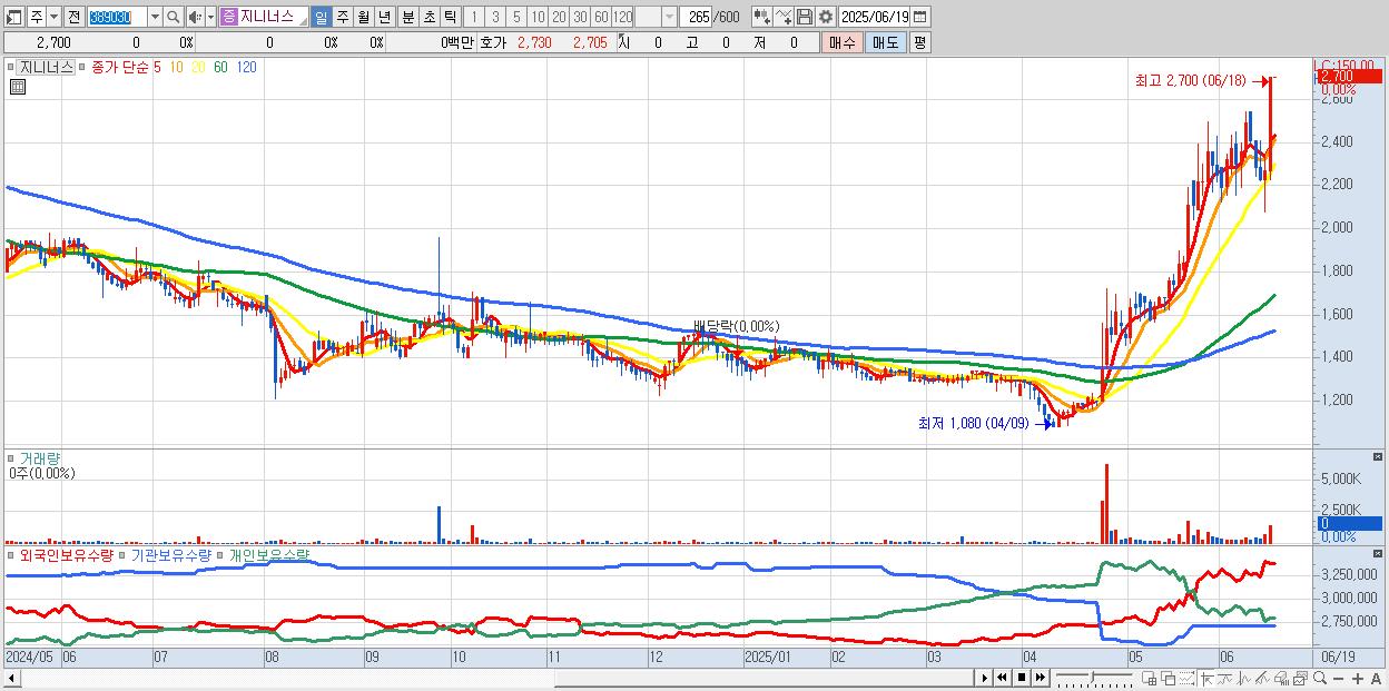 - 지니너스 (2,700원 ▲ 18.94% , 시총: 900억, 거래량: 1,434,594, 거래대금:36억, KOSDAQ)