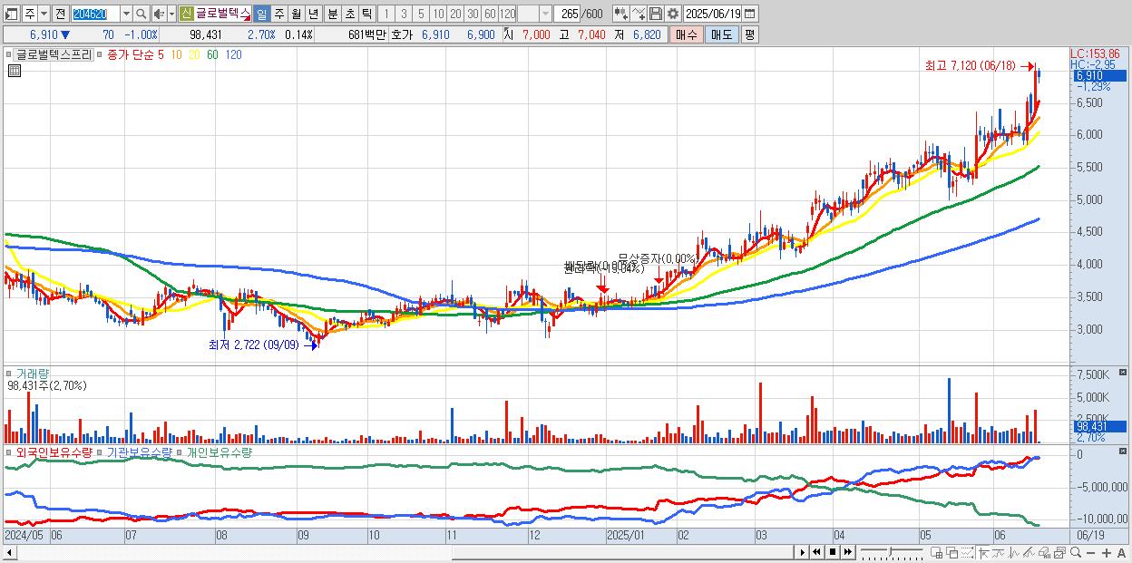 - 글로벌텍스프리 (6,980원 ▲ 9.92% , 시총: 4,906억, 거래량: 2,488,615, 거래대금:172억, KOSDAQ)