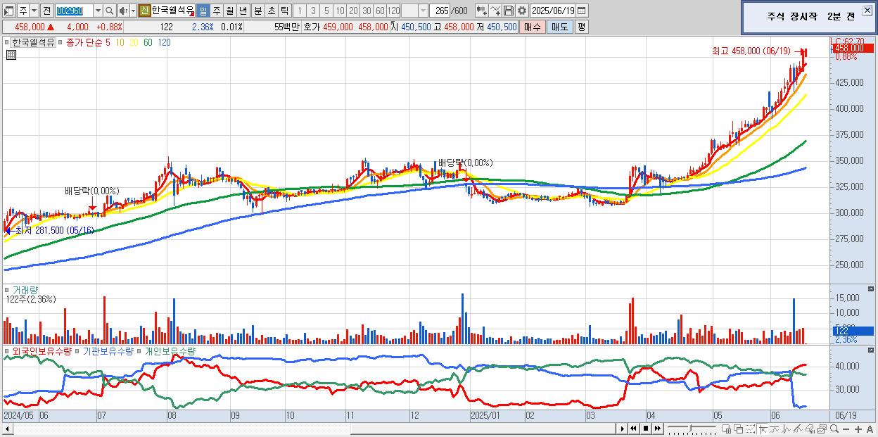 - 한국쉘석유 (454,000원 ▲ 3.42% , 시총: 5,902억, 거래량: 3,747, 거래대금:17억, KOSPI)