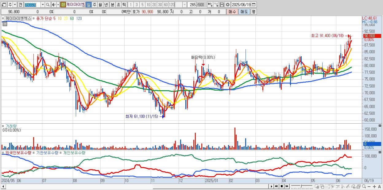 - 케이아이엔엑스 (90,800원 ▲ 1.79% , 시총: 4,431억, 거래량: 30,652, 거래대금:27억, KOSDAQ)