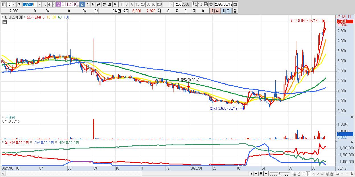 - 디에스케이 (7,960원 ▲ 4.74% , 시총: 2,047억, 거래량: 222,950, 거래대금:18억, KOSDAQ)