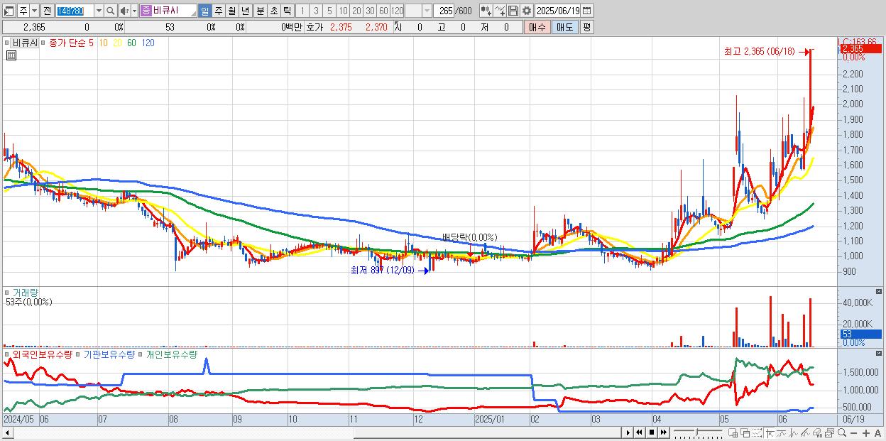 - 비큐AI (2,365원 ▲ 29.87% , 시총: 744억, 거래량: 44,182,491, 거래대금:955억, KOSDAQ)