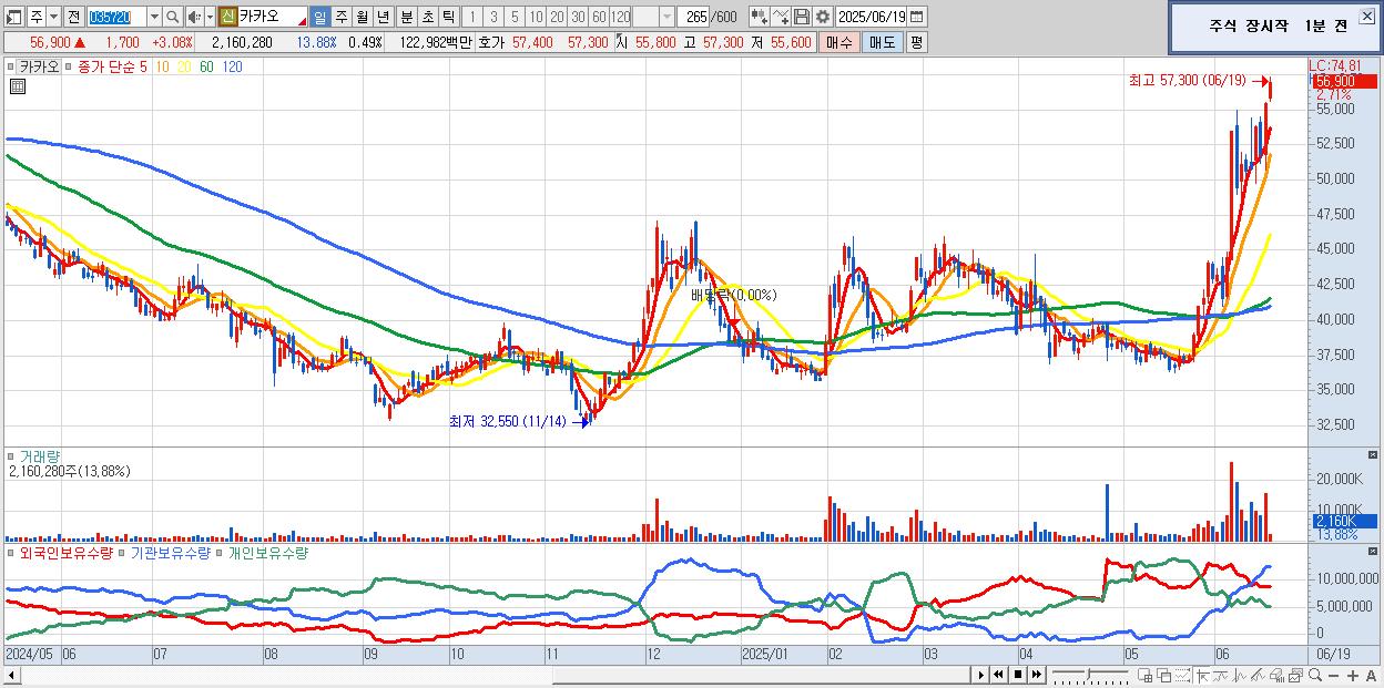 - 카카오 (55,200원 ▲ 6.56% , 시총: 243,855억, 거래량: 8,380,598, 거래대금:4,550억, KOSPI)