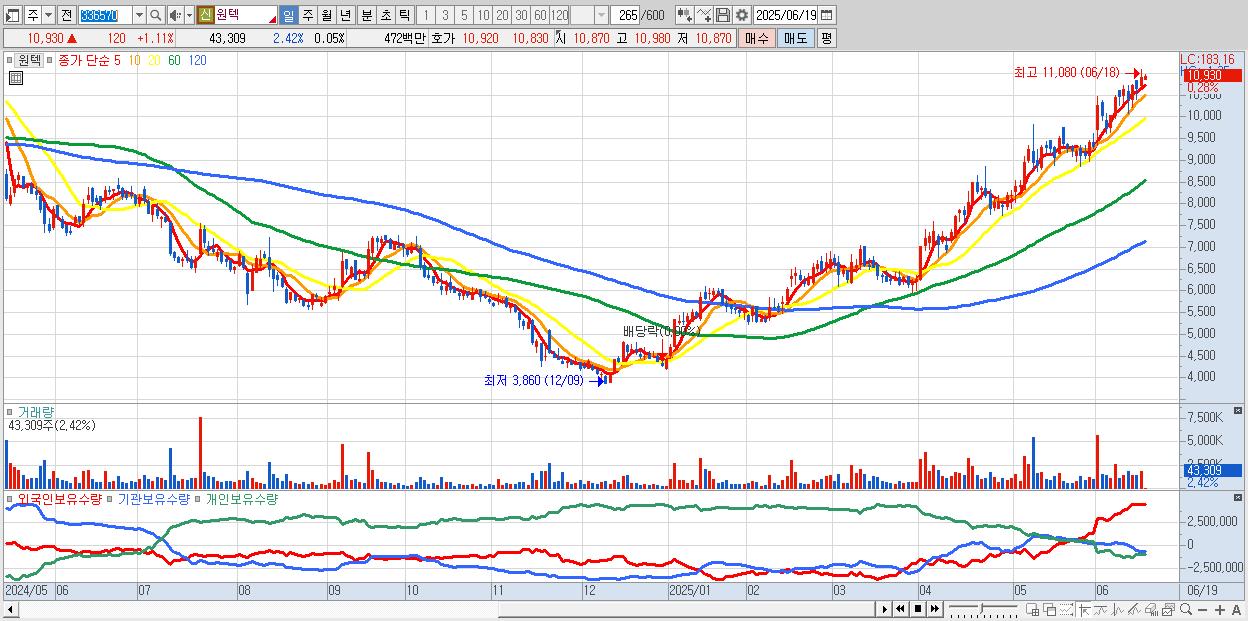 - 원텍 (10,810원 ▲ 1.5% , 시총: 9,668억, 거래량: 949,886, 거래대금:103억, KOSDAQ)
