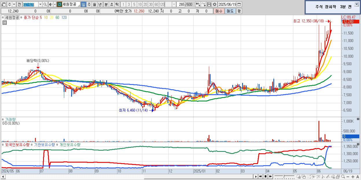 - 세원정공 (12,240원 ▲ 6.43% , 시총: 1,224억, 거래량: 77,271, 거래대금:9억, KOSPI)