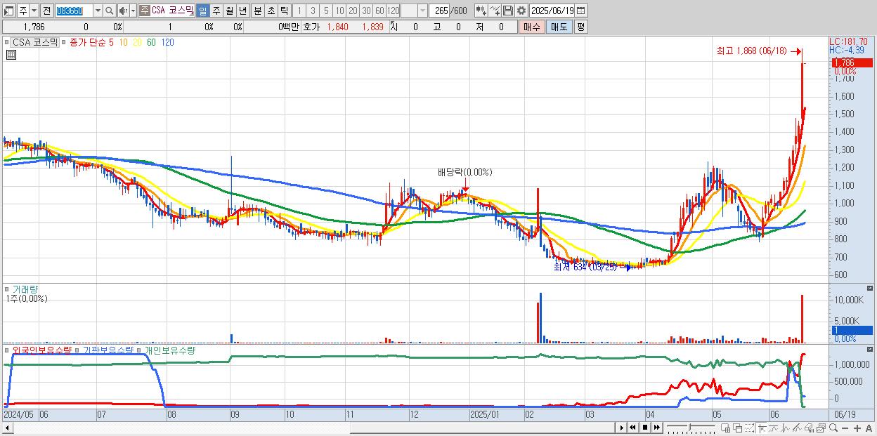 - CSA 코스믹 (1,786원 ▲ 24.29% , 시총: 1,094억, 거래량: 11,475,650, 거래대금:200억, KOSDAQ)