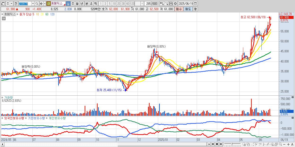 - 휴메딕스 (61,000원 ▲ 4.99% , 시총: 6,850억, 거래량: 215,744, 거래대금:130억, KOSDAQ)