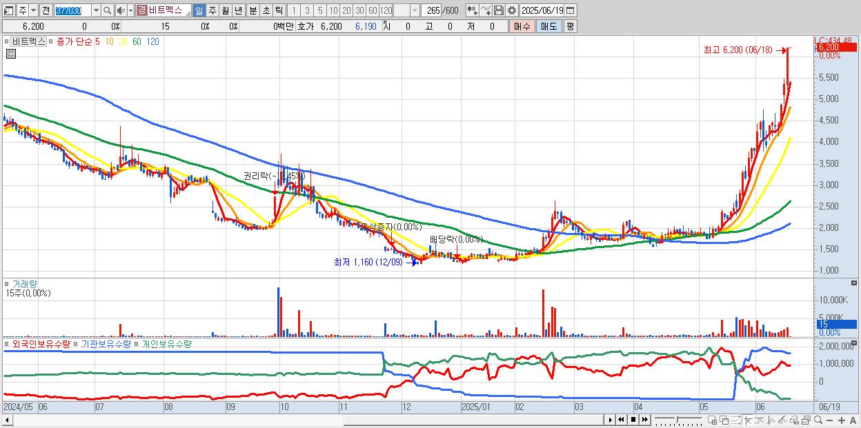 - 비트맥스 (6,200원 ▲ 15.89% , 시총: 2,308억, 거래량: 2,473,584, 거래대금:147억, KOSDAQ)