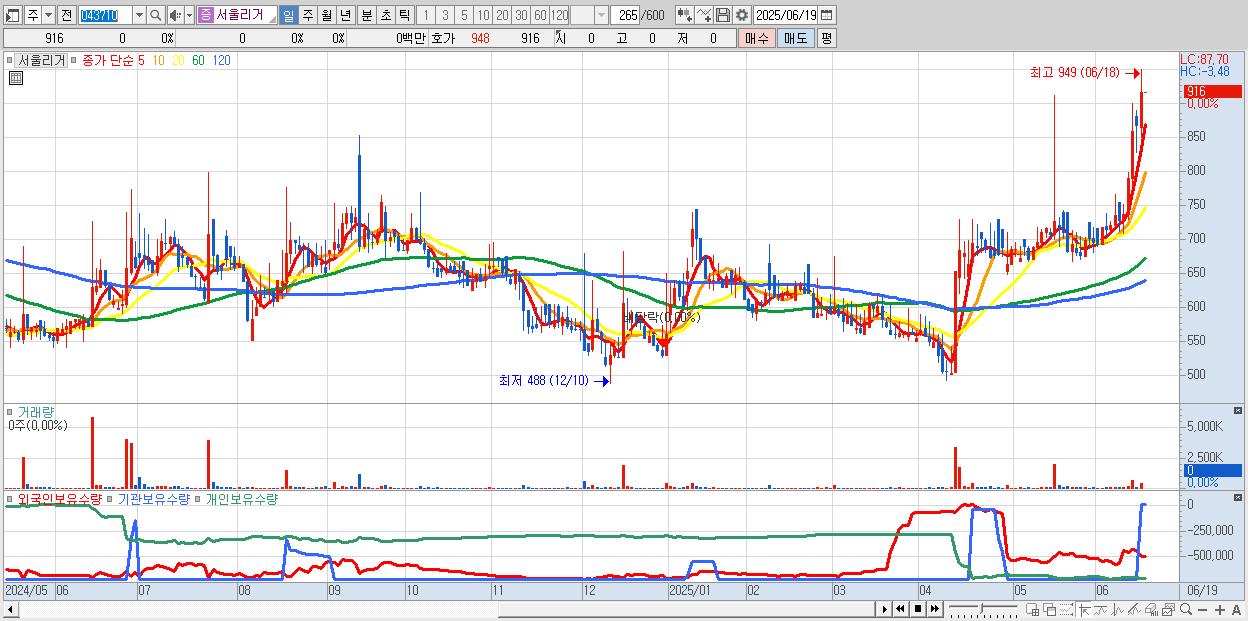 - 서울리거 (916원 ▲ 5.65% , 시총: 793억, 거래량: 447,602, 거래대금:4억, KOSDAQ)
