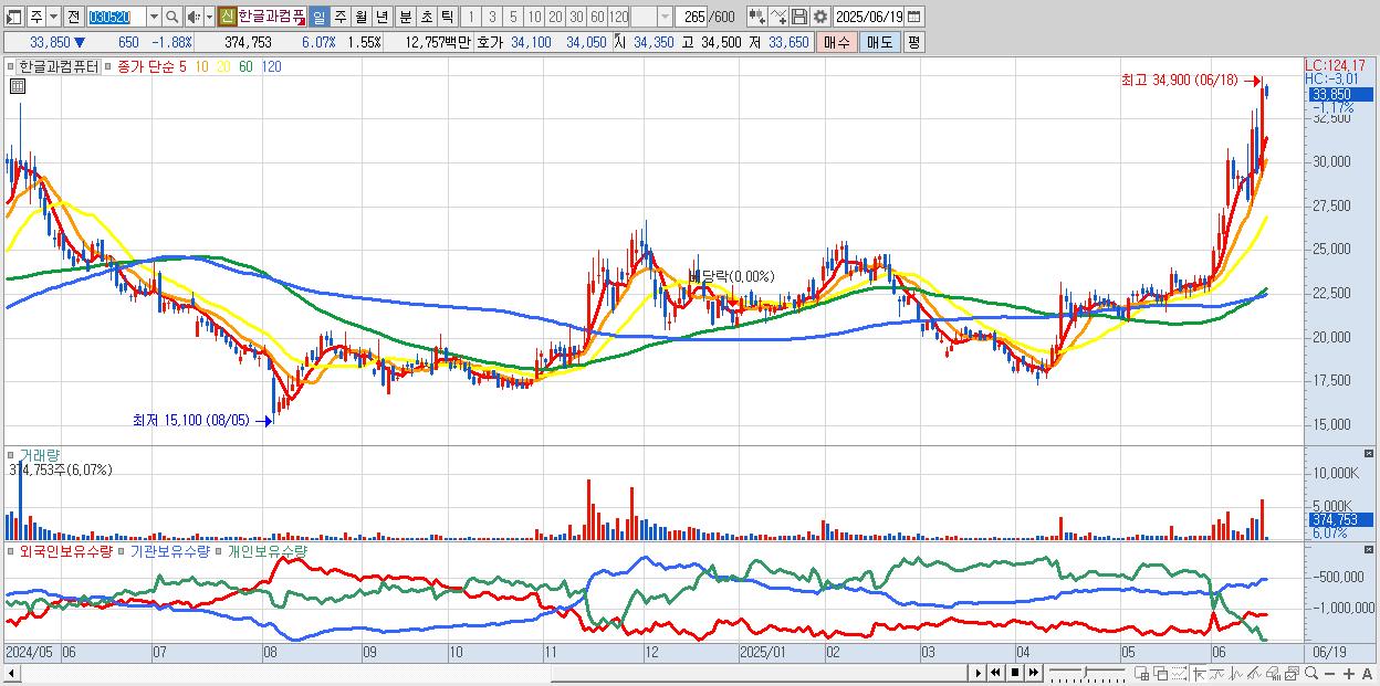 - 한글과컴퓨터 (34,500원 ▲ 14.05% , 시총: 8,342억, 거래량: 3,096,090, 거래대금:1,015억, KOSDAQ)
