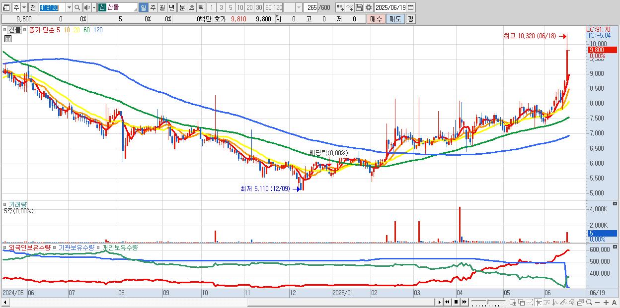 - 산돌 (9,800원 ▲ 12% , 시총: 762억, 거래량: 1,220,762, 거래대금:118억, KOSDAQ)