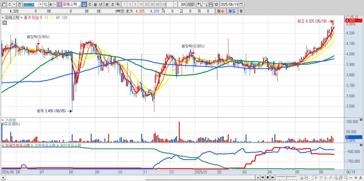 - 피에스텍 (4,320원 ▲ 1.29% , 시총: 833억, 거래량: 21,010, 거래대금:1억, KOSDAQ)
