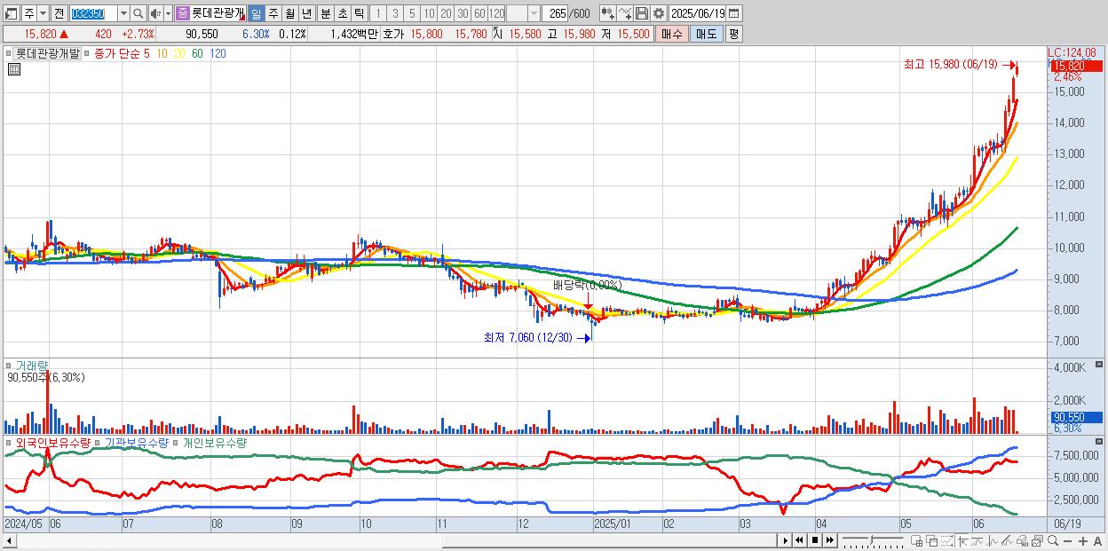 - 롯데관광개발 (15,400원 ▲ 4.83% , 시총: 11,789억, 거래량: 928,672, 거래대금:142억, KOSPI)