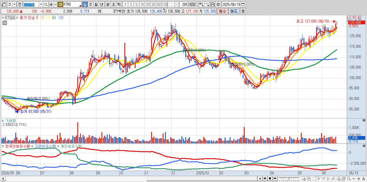 - KT&G (126,500원 ▲ 2.26% , 시총: 154,409억, 거래량: 375,694, 거래대금:473억, KOSPI)