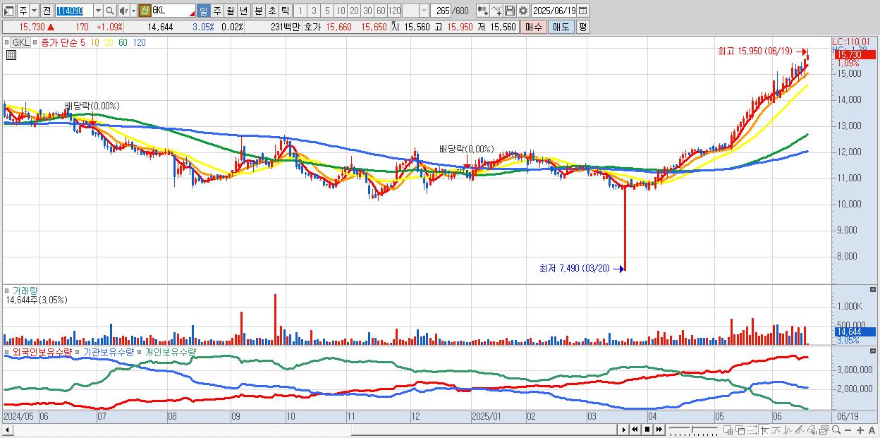 - GKL (15,560원 ▲ 2.44% , 시총: 9,625억, 거래량: 325,457, 거래대금:50억, KOSPI)