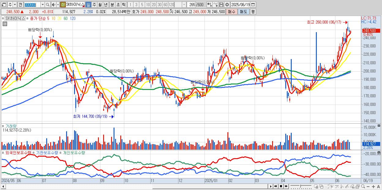 - SK하이닉스 (246,500원 ▼ -1% , 시총: 1,794,526억, 거래량: 4,081,001, 거래대금:10,097억)