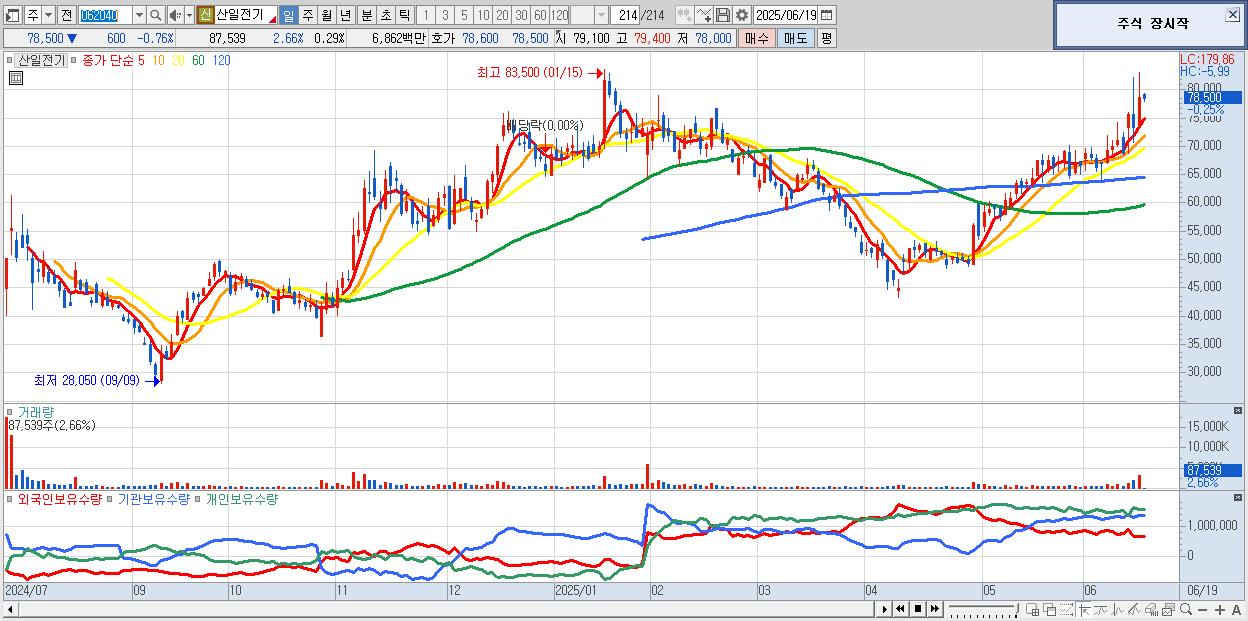 - 산일전기 (79,100원 ▲ 8.06% , 시총: 24,082억, 거래량: 1,773,432, 거래대금:1,412억)