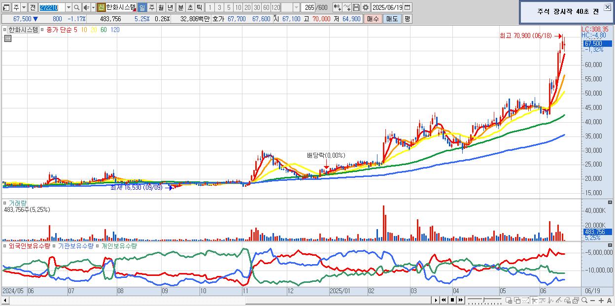 - 한화시스템 (68,300원 ▲ 3.17% , 시총: 129,032억, 거래량: 3,608,775, 거래대금:2,469억)