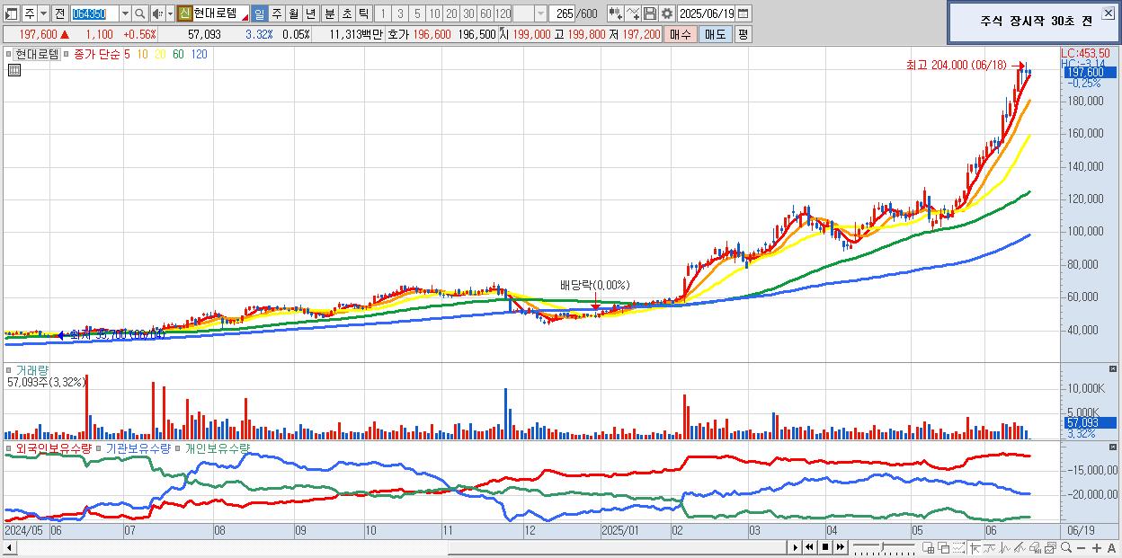 - 현대로템 (196,500원 ▼ -0.76% , 시총: 214,465억, 거래량: 1,081,241, 거래대금:2,152억)