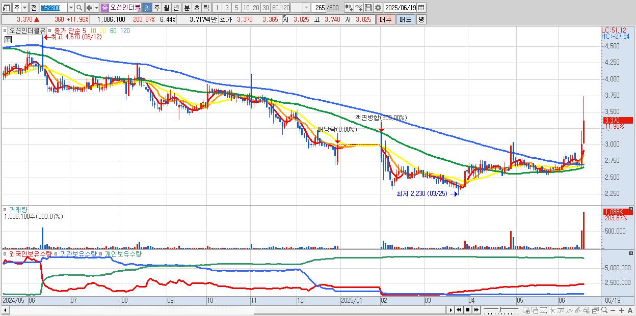 - 오션인더블유 (3,370원 ▲ 11.96% , 시총: 568억, 거래량: 1,086,100, 거래대금:37억, KOSDAQ)