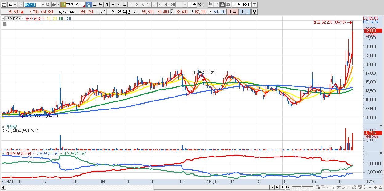 - 한전KPS (59,000원 ▲ 13.9% , 시총: 26,550억, 거래량: 1,650,856, 거래대금:910억, KOSPI)