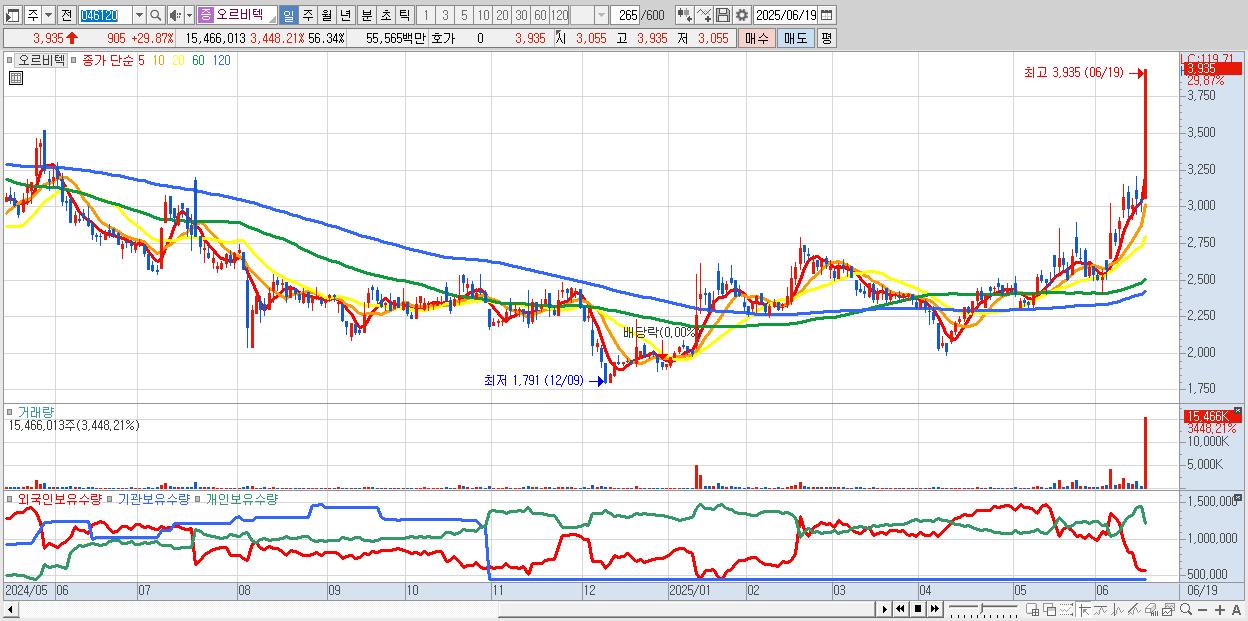 - 오르비텍 (3,935원 ▲ 29.87% , 시총: 1,080억, 거래량: 15,466,013, 거래대금:556억, KOSDAQ)