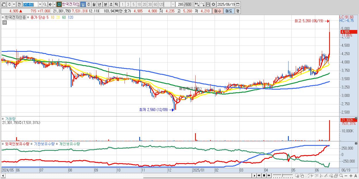 - 한국전자인증 (4,905원 ▲ 17.06% , 시총: 932억, 거래량: 21,301,793, 거래대금:1,039억, KOSDAQ)