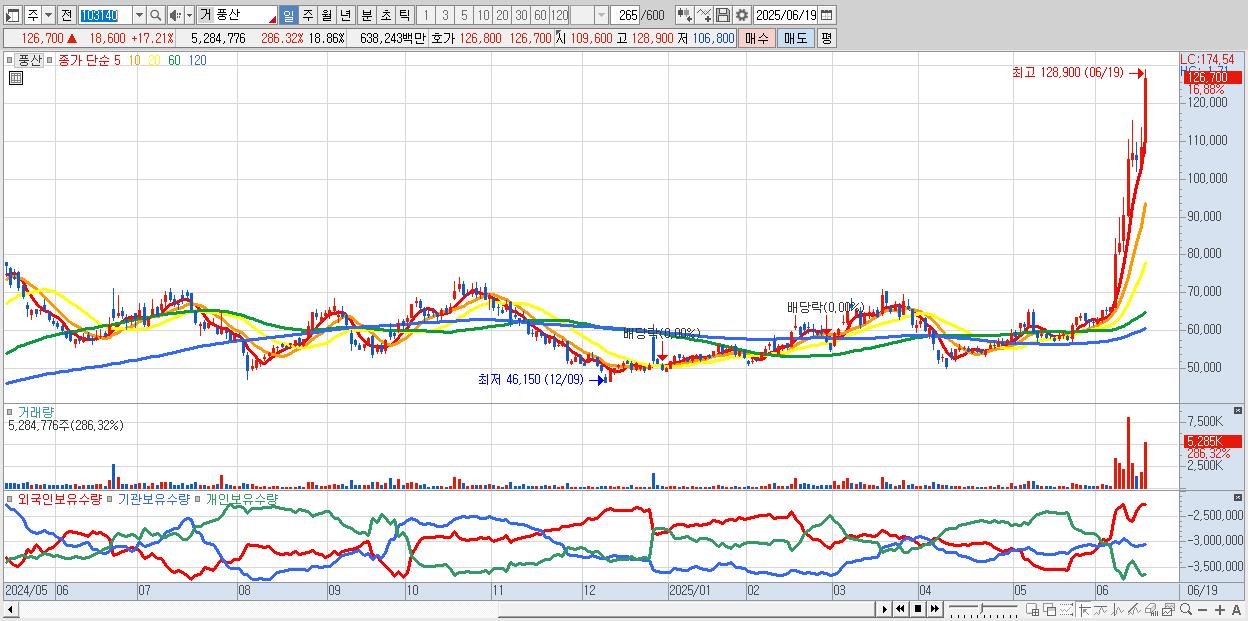 - 풍산 (126,500원 ▲ 17.02% , 시총: 35,451억, 거래량: 3,133,893, 거래대금:3,784억, KOSPI)