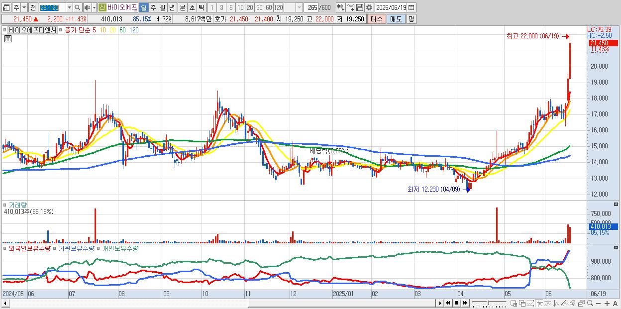 - 바이오에프디엔씨 (21,450원 ▲ 11.43% , 시총: 1,865억, 거래량: 410,013, 거래대금:86억, KOSDAQ)