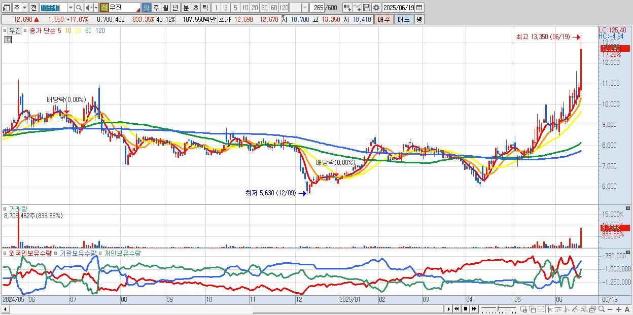 - 우진 (12,780원 ▲ 17.9% , 시총: 2,581억, 거래량: 4,163,073, 거래대금:511억, KOSPI)