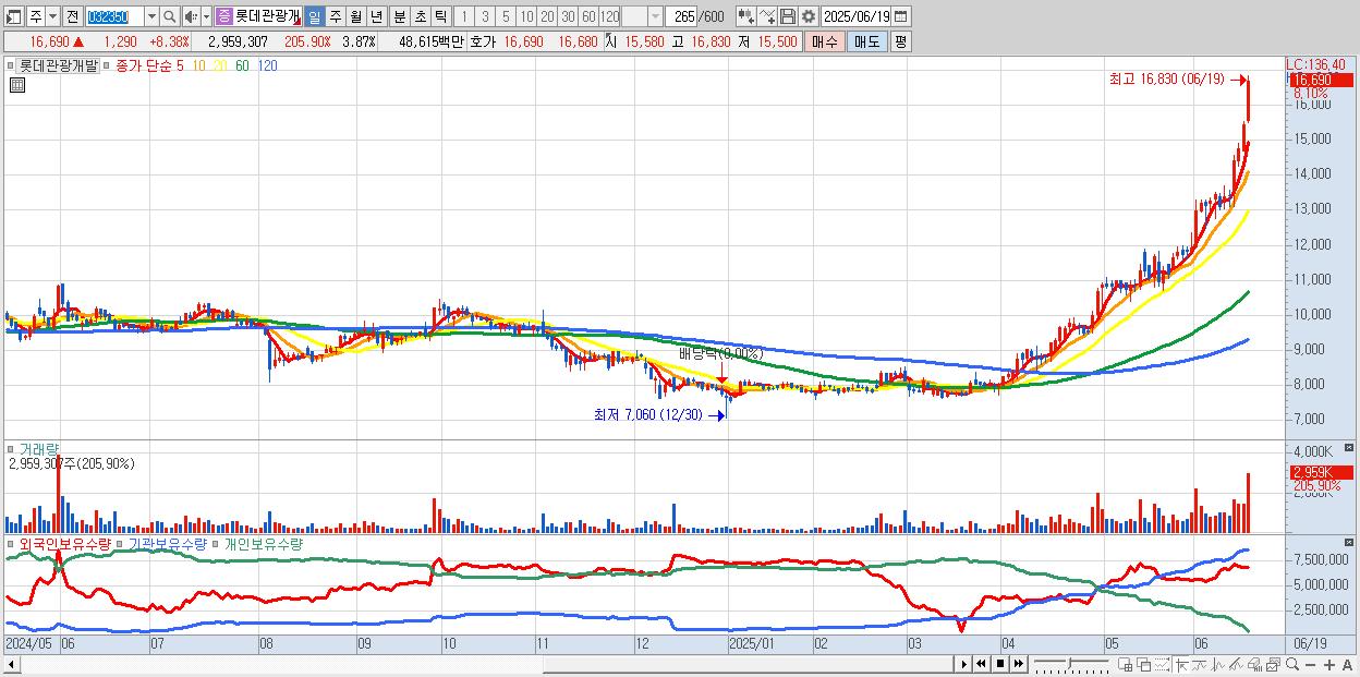 - 롯데관광개발 (16,830원 ▲ 9.29% , 시총: 12,884억, 거래량: 2,036,977, 거래대금:335억, KOSPI)