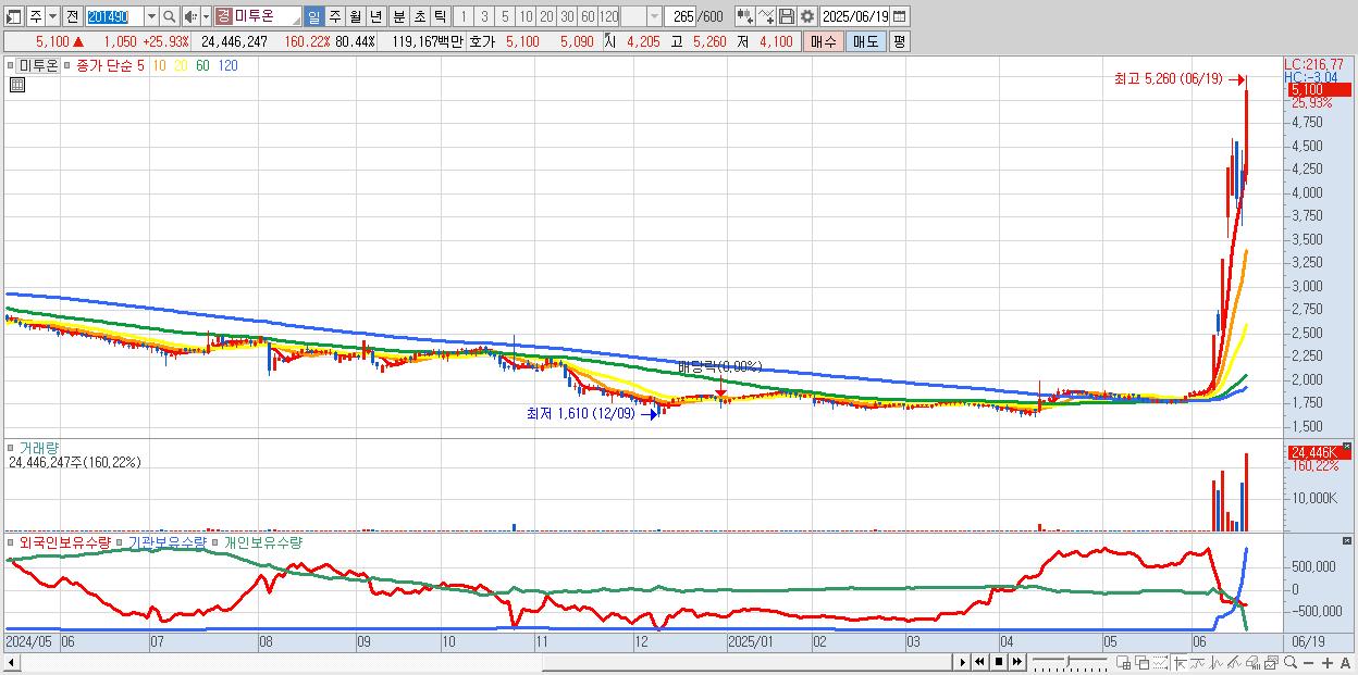 - 미투온 (5,100원 ▲ 25.93% , 시총: 1,550억, 거래량: 24,446,247, 거래대금:1,192억, KOSDAQ)