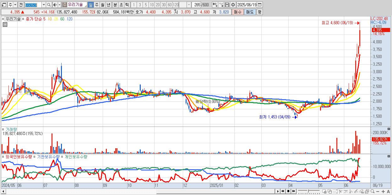 - 우리기술 (4,395원 ▲ 14.16% , 시총: 7,275억, 거래량: 135,827,480, 거래대금:5,842억, KOSDAQ)