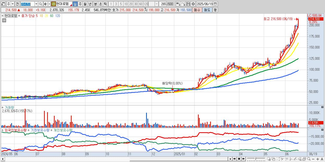 - 현대로템 (212,000원 ▲ 7.89% , 시총: 231,382억, 거래량: 1,562,014, 거래대금:3,185억, KOSPI)