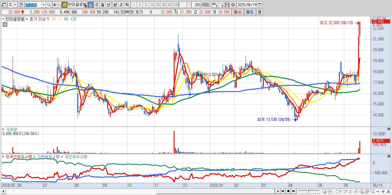 - 한미글로벌 (22,600원 ▲ 29.89% , 시총: 2,476억, 거래량: 3,253,023, 거래대금:721억, KOSPI)