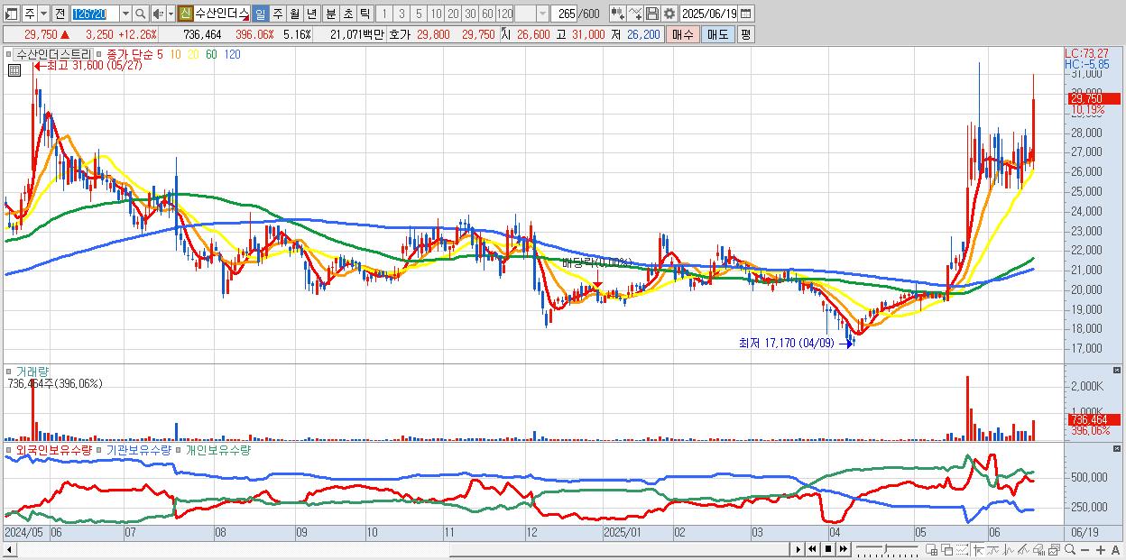 - 수산인더스트리 (29,700원 ▲ 12.08% , 시총: 4,243억, 거래량: 366,536, 거래대금:104억, KOSPI)